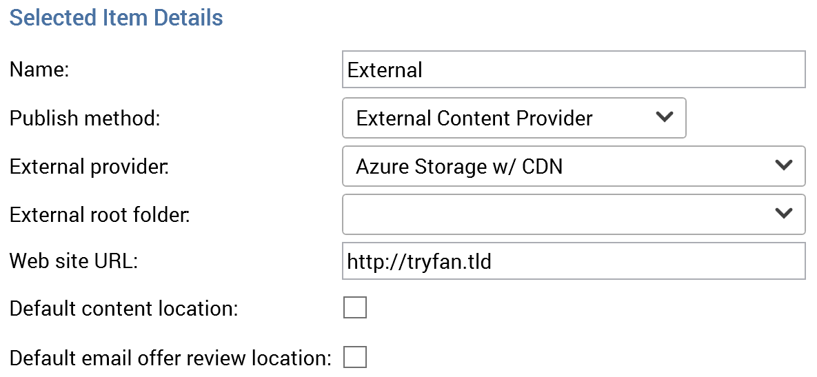 If an external content provider web publish site is selected, the following properties are displayed: