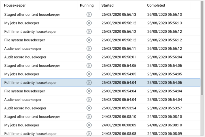 Audience housekeeper: responsible for the removal of leftover temporary audience tables from the data warehouse. An audience may remain in a Paused, Failed or Rolled Back state for 28 days before expiry. An audience may remain in a Playing state without occurrence of new activity for 100 days. A Completed or Stopped audience remains stored in the database for 7 days.