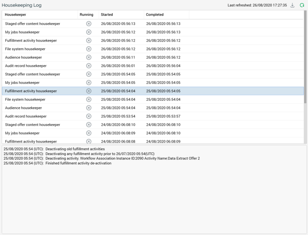 You can highlight a housekeeper execution instance in the results grid in order to view read-only related log messages in the selected housekeeper details field.