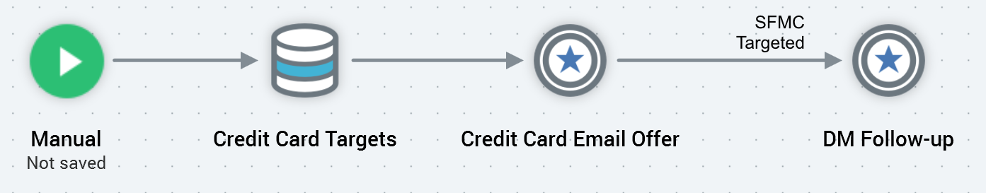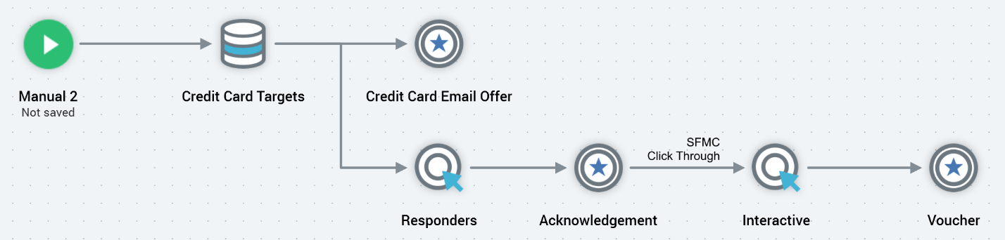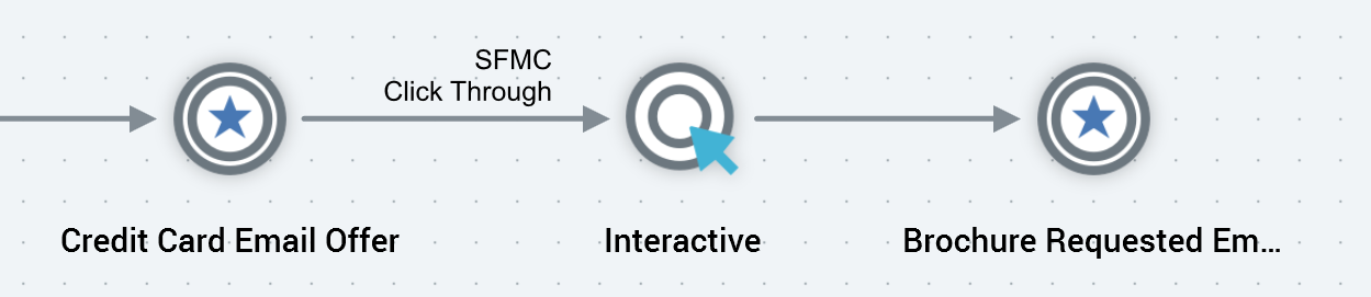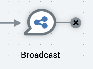In the case of a broadcast, it is not possible to continue a dialogue with the targeted audience – a broadcast is published to the world at large (e.g. via a Twitter account). As such, it is not possible to add activities downstream of a broadcast activity, which is shown with a ‘dead end’ icon to its right: