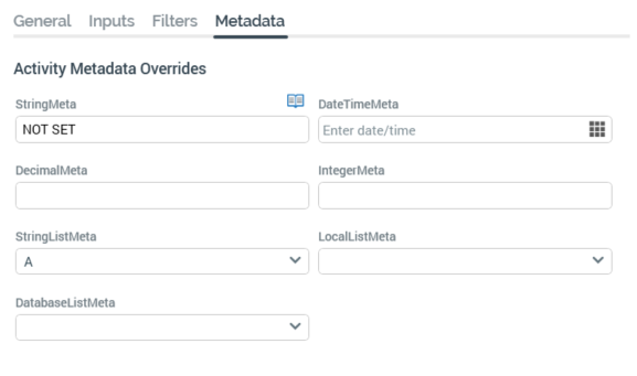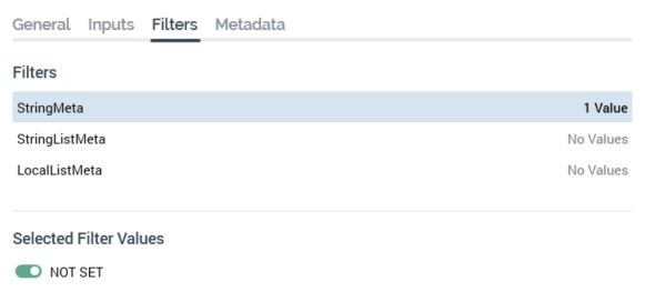 Filters grid: the grid lists all metadata attributes made available by the preceding activity. You can select a metadata attribute.