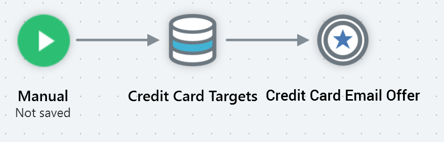 When you drag a file from the bottom (search/folders) section of the toolbox and drop it onto the workspace, a pre-configured activity of the relevant type is added (e.g. dropping an offer onto the workspace creates a new offer activity). You can also drag a file and drop it onto an activity of an appropriate type to configure the activity (e.g. dropping an audience onto a batch audience configures the batch audience with the template).