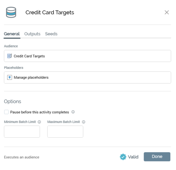 A new activity is named in accordance with its activity type or file name (e.g. a new, unconfigured batch audience is named ‘Batch’; an offer activity based on offer ‘Credit Card Email Offer’ is given an identical name). If an activity with the same name exists already in the workspace, an integer is appended to the activity name to ensure uniqueness; this number may be incremented if required.