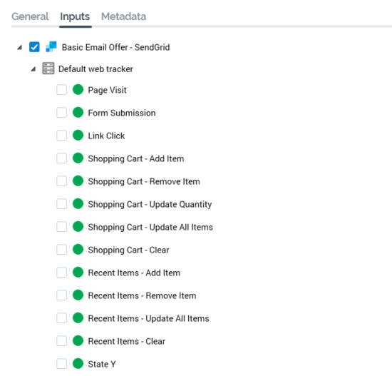 The fourth level of the treeview is only relevant to the Salesforce Marketing Cloud Email Click Through state. It lists any URLs included within the Salesforce Marketing Cloud email offer content and is enabled when the Click Through state is checked. Each URL is accompanied by a checkbox. You can check one or more checkboxes to indicate that recipients clicking on the URL(s) in question within the received in email are to be targeted by the downstream fulfillment activity
