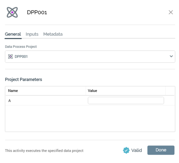 A dropdown field, it lists all configured data process projects, which are presented in alphabetical order, and each accompanied by an icon (custom if so configured). If you choose a data process project with a custom icon, the activity icon as displayed at the Interaction Designer workspace is updated accordingly. Selection of a data process project is mandatory.