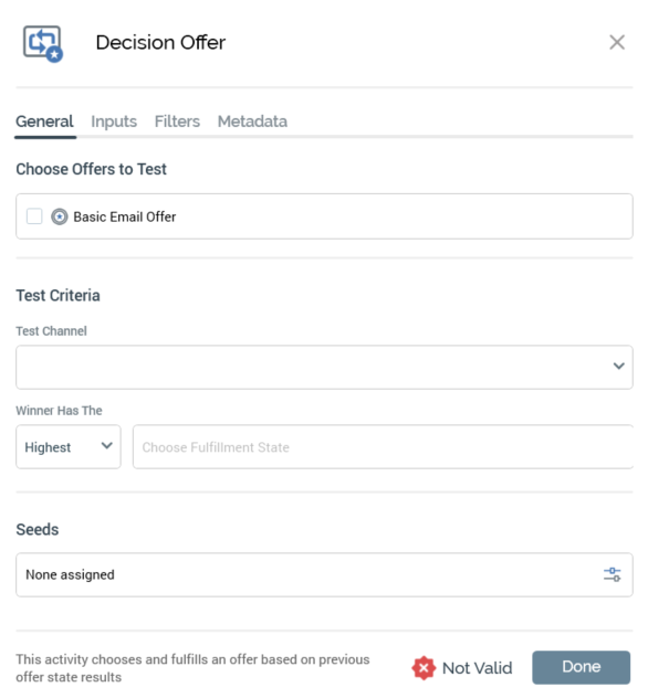 A decision offer’s configuration panel contains up to three tabs: General, Inputs and Filters.