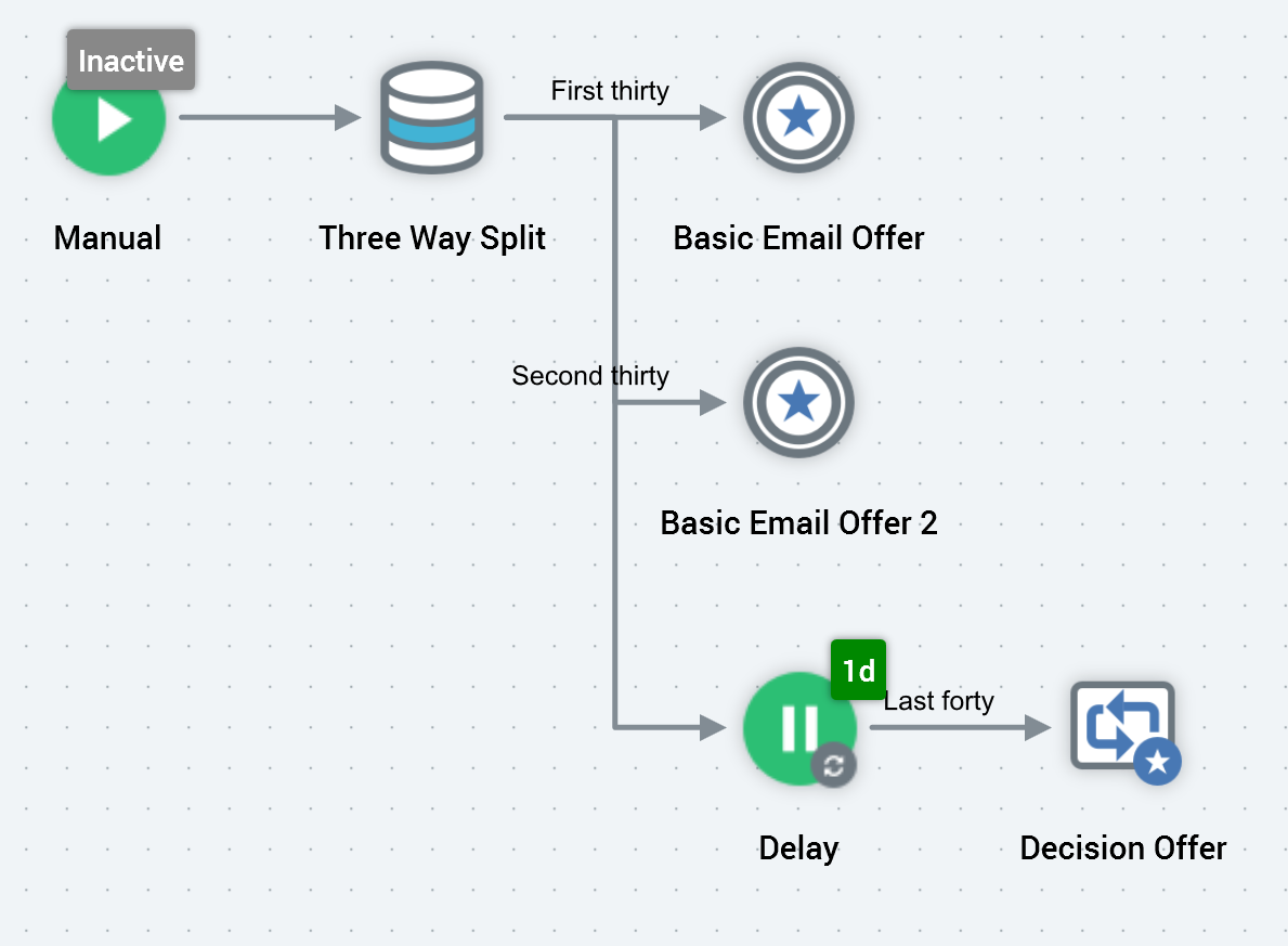 A decision offer is placed after the delay. It is configured to use the Basic Email Offers as test offers, with the 40% split as its input data. In addition, it is configured to send the winning test offer to its input data set.