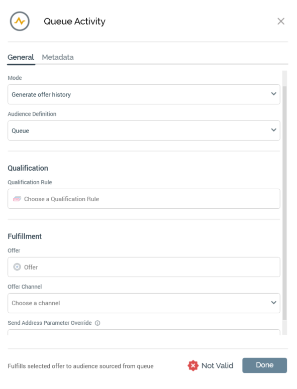 Don't generate offer history: when selected, on execution of the queue activity, an offer history record is not written. The Metadata tab is not shown when this value is selected.