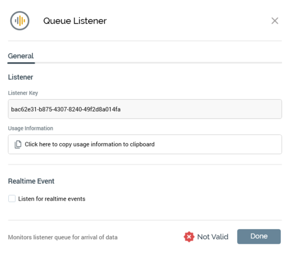 A queue listener allows you to monitor a ‘listener queue’ for the arrival of data. Data arrives in the form of JSON packages – placed on the queue either by an external system, or at submission of a web form.