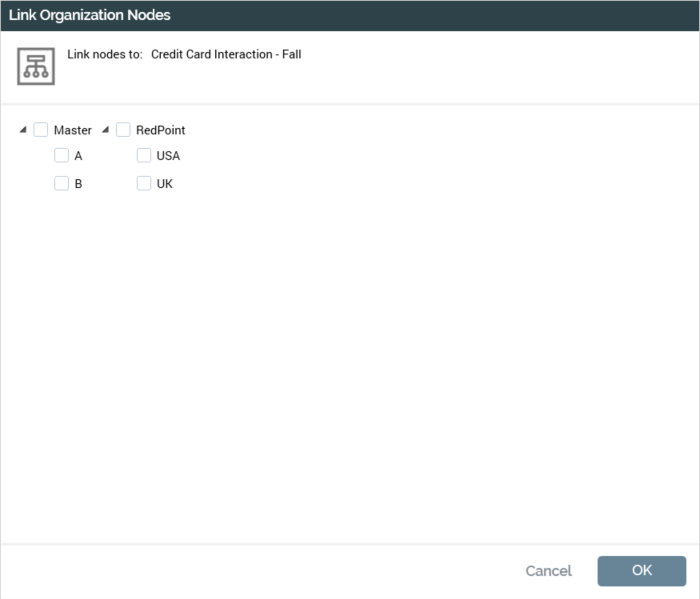 If your user account is not linked to any organization user groups, an interaction is linked implicitly to the top node of each hierarchy in the organization. If you add a link to any hierarchy node below the top level, links to all other nodes within that hierarchy to which the interaction is to be linked must be defined explicitly.