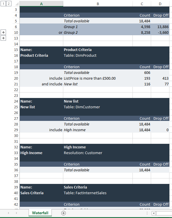 On clicking Open File, the waterfall report is displayed in Excel (which must be installed for the report to be run). A waterfall report contains.