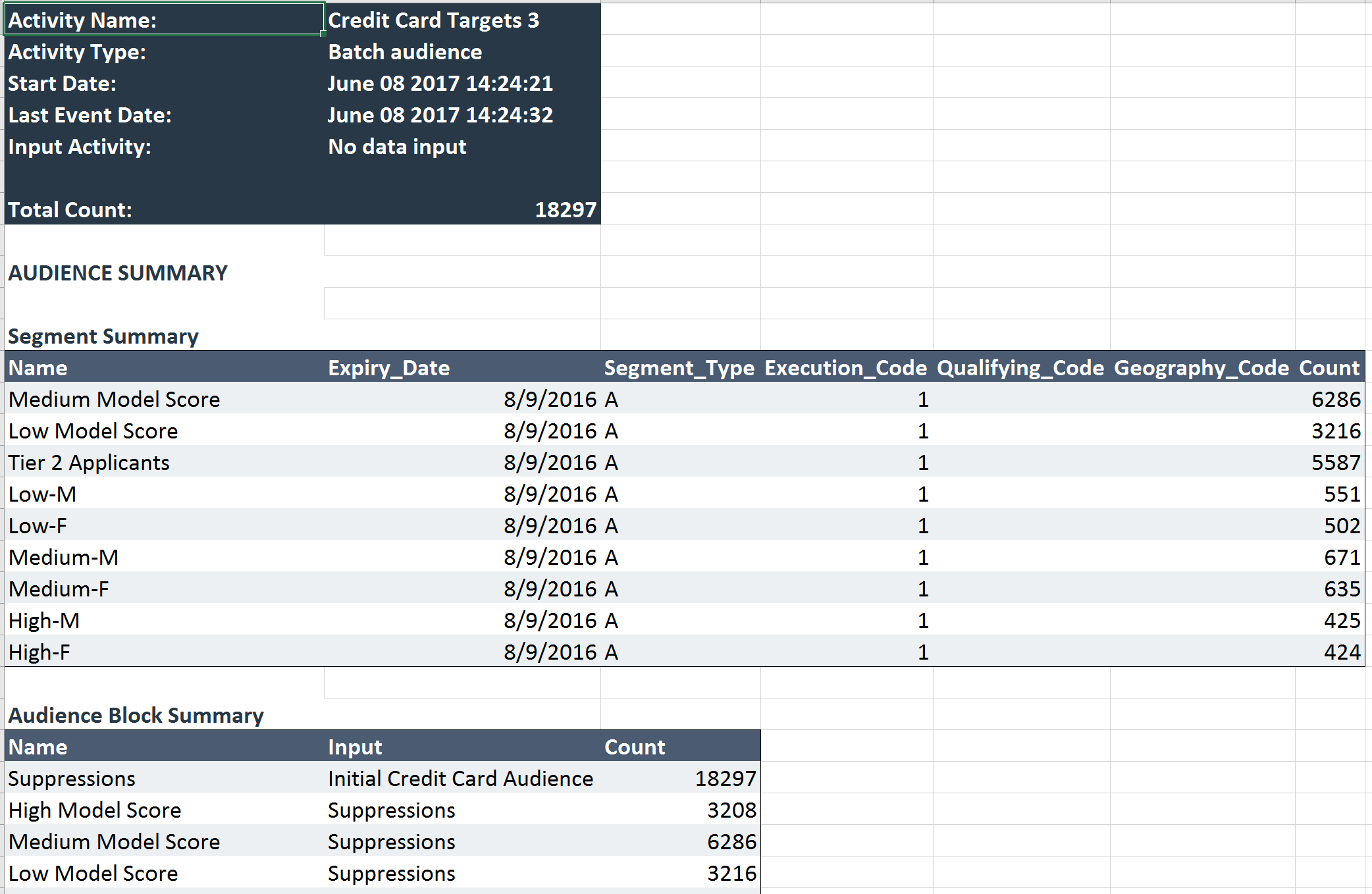 Audience Block Summary: one row is shown per audience block. For each block, the following are shown: