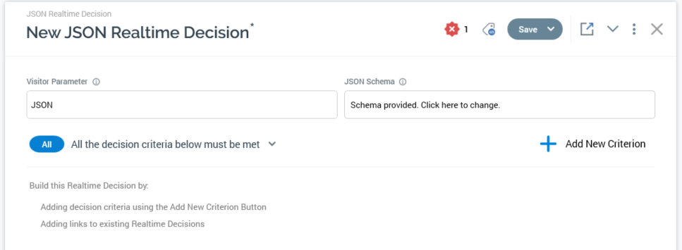 JSON Schema: allows you to provide a piece of JSON, which will be used as the basis for determining the types of decision criteria available at the Realtime decision. At its initial display, the following text is shown: