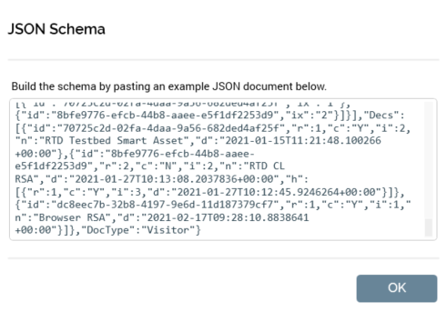 Valid JSON document: you can paste or enter a JSON document in this multi-line field. The example provided will be used as a schema to establish the list of decision criteria types available to the Realtime decision. Clicking the OK button removes the dialog from display. If you provided a JSON example the property's text is changed as follows: