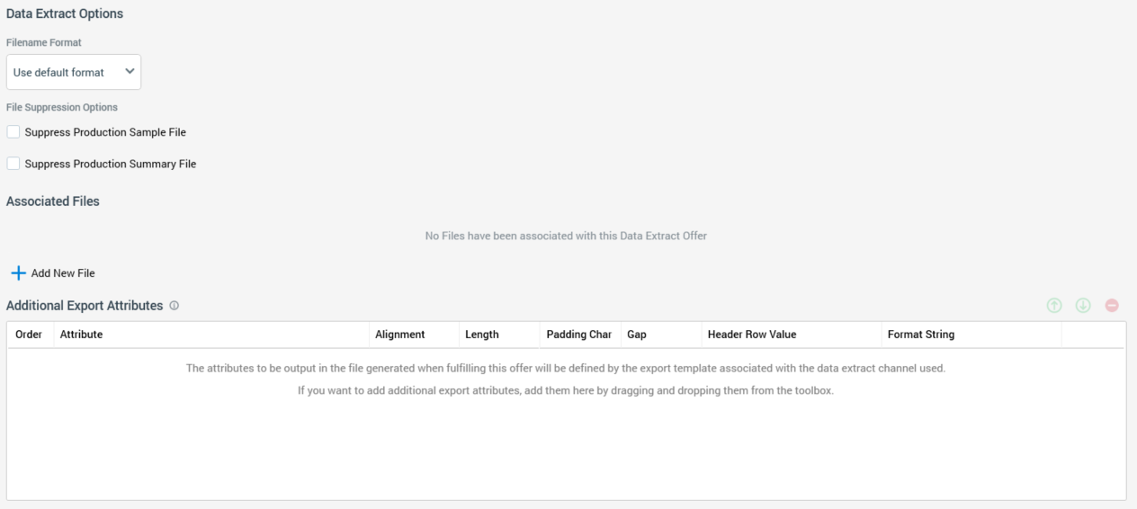 Suppress production summary file: this checkbox is unchecked by default. If checked, when the data extract offer is executed in a production interaction workflow, the summary file is not produced.