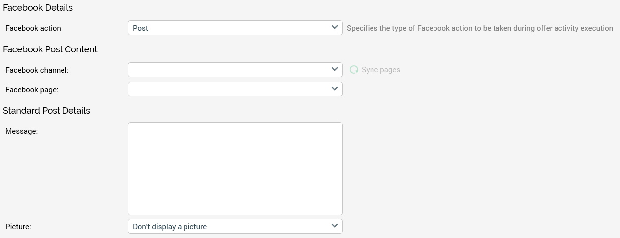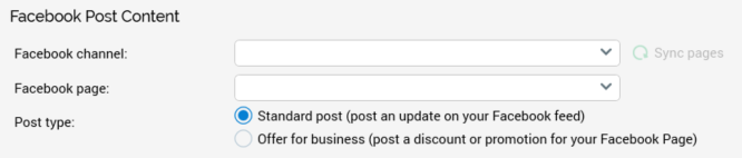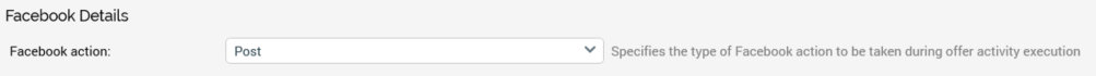 This section is shown if Facebook action is set to Post. It exposes the following: