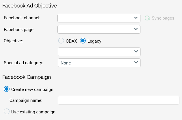 Facebook channel: this dropdown field presents a list of the existing Facebook Marketing channels. Selection of a channel is mandatory.