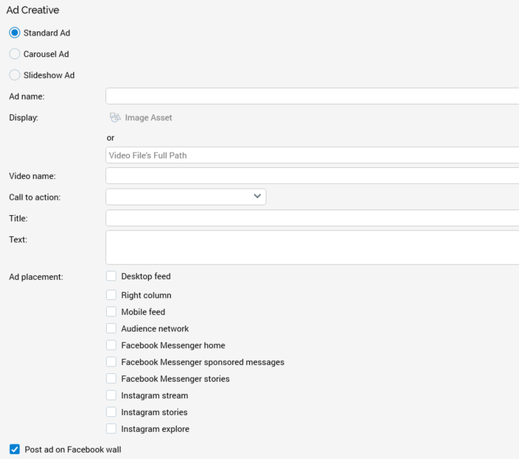Post app ad on Facebook wall: a checkbox, checked by default, which defines whether the ad will be posted on the account’s page’s timeline.