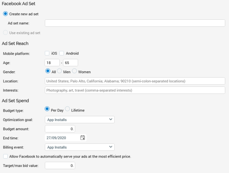 [Existing ad set]: this dropdown field is visible and mandatory when the Use existing ad set radio button is selected. It lists existing ad sets tied to the selected Facebook Marketing campaign and accordant with the selected. Choosing an existing ad set refreshes the fields displayed below.