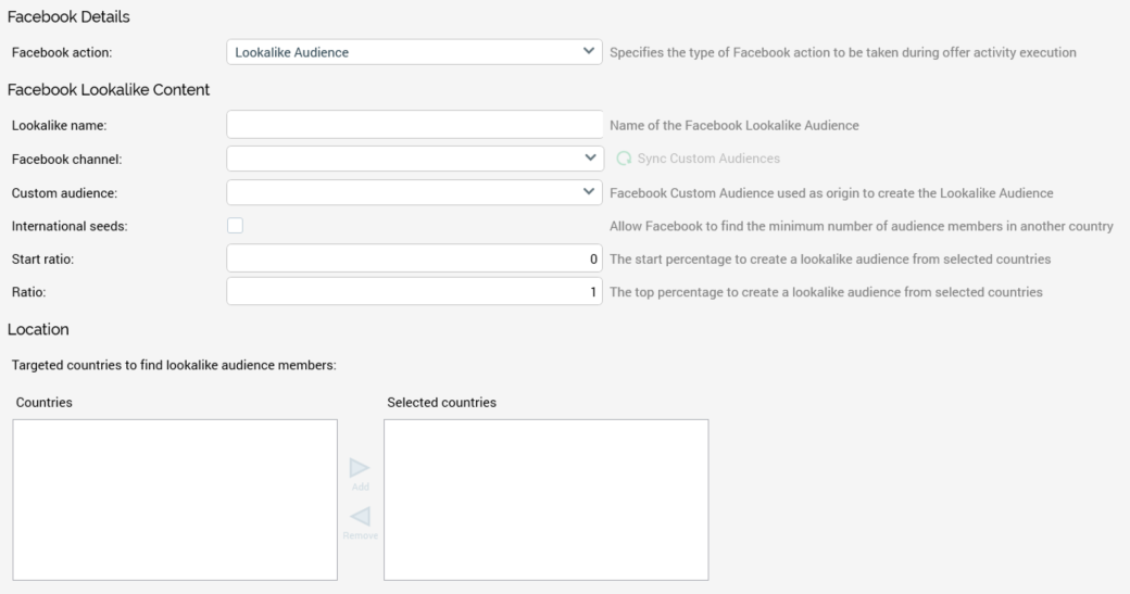 This section is used to specify the list of countries that Facebook can use to find a match to the selected Custom Audience when creating a Lookalike Audience. It is displayed when Facebook action is set to Lookalike Audience. It contains the following: