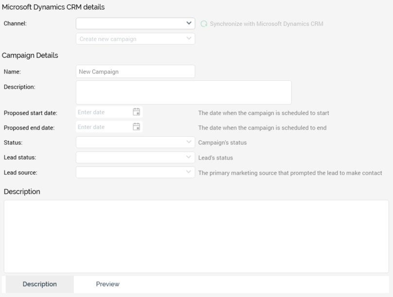 Campaign: this property is only available if Use existing campaign is selected. The dropdown is initially empty and is populated on invocation of Synchronize with Microsoft Dynamics CRM. It lists all existing campaigns from the selected Microsoft Dynamics CRM Channel that have statuses accordant with the selected channel’s Use campaign with status setting.