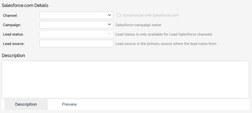 Channel: a dropdown field that is populated with all Salesforce.com channels as defined at the Channels configuration interface. Selection of a channel is mandatory and enables the Synchronize with Salesforce.com button.