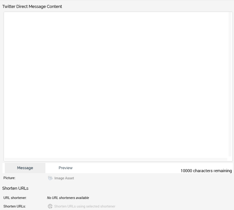 Twitter Direct Message Content: this property contains a tabset, with Message and Preview tabs.