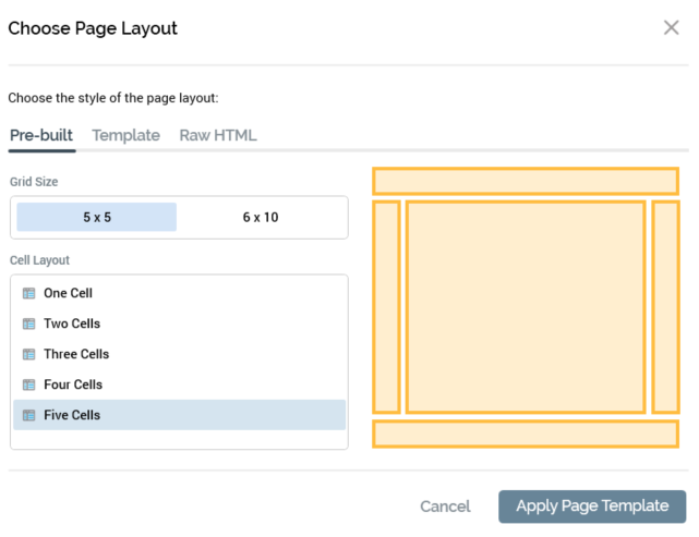 Choose the style of the page layout: you can select from a Pre-built, HTML template or Raw HTML based layout (the most-recently used grid layout is selected by default).