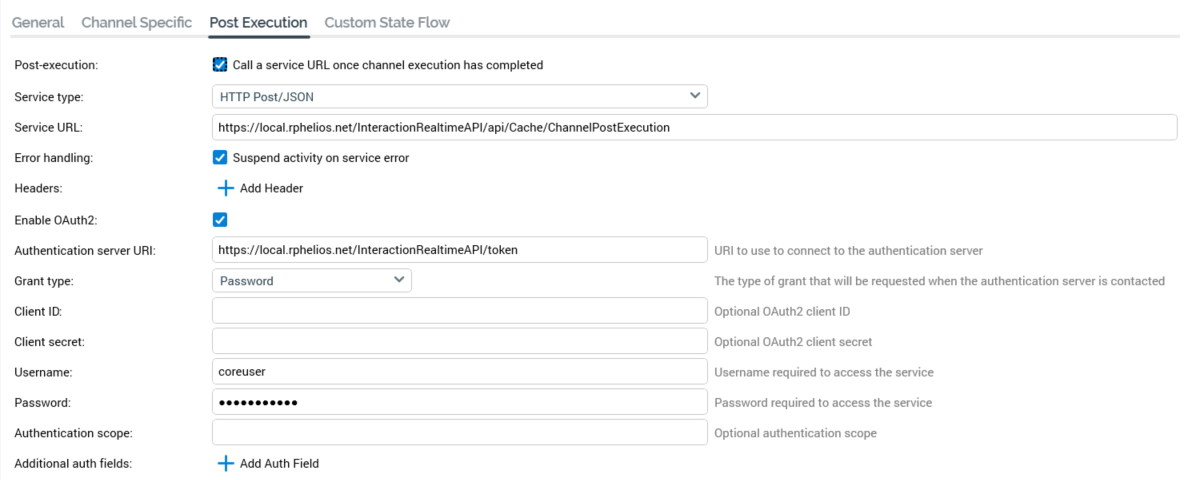 Post-execution: this checkbox, unchecked by default, is accompanied by the text ‘Call a service URL once channel execution has completed’. It allows you, at channels where supported, to provide the address of a web service to be called each time the channel is used in an interaction, just prior to the activity’s completion.