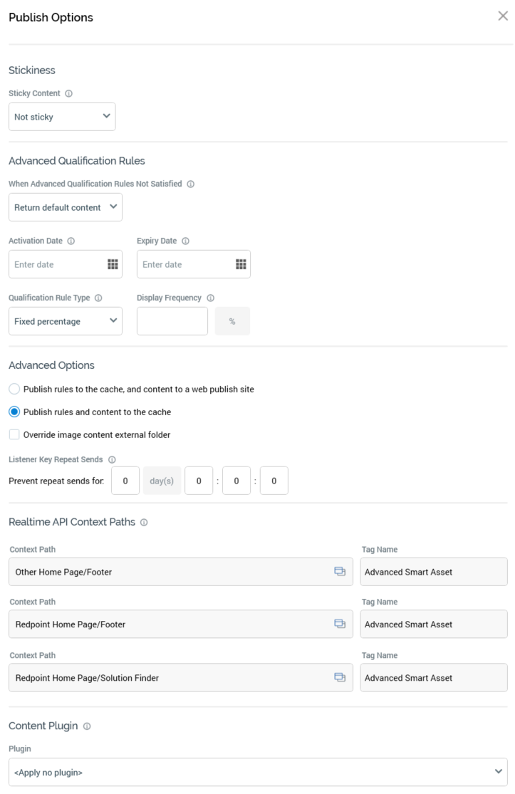 The Content Plugin section allows you to select a plugin to which the content served by the dynamic asset will be passed. A plugin is a piece of custom code, written to perform a specific task to a client’s requirements. The section is only displayed if system configuration setting RealtimeContentPlugins has been configured with a managed list. For more information, please see the Configuration documentation.