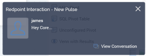 This lists all direct Pulses you have received in your current RPI session. When you hover over a Pulse in the dialog, a View Pulse Conversation button is displayed. Clicking it displays the conversation's pulses in the Pulses Window.