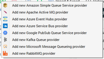 This is carried out in the toolbar, by clicking the Create new Queue Provider button. When you do so, a sub-menu is displayed: