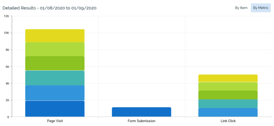 By Item: this tab is shown by default. It displays one stacked bar per landing page in the visible date range shown in the Overview line chart.