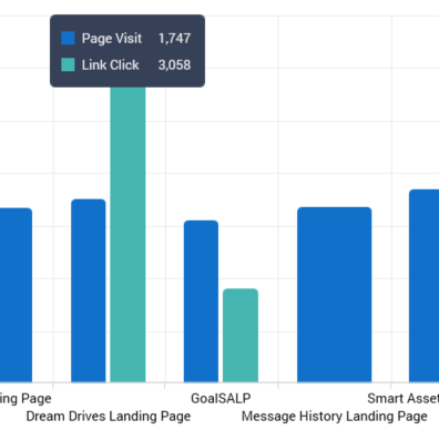 Data is presented as time series of activity across a user-definable date range and is also aggregated by landing page and metric and presented as stacked bar charts.