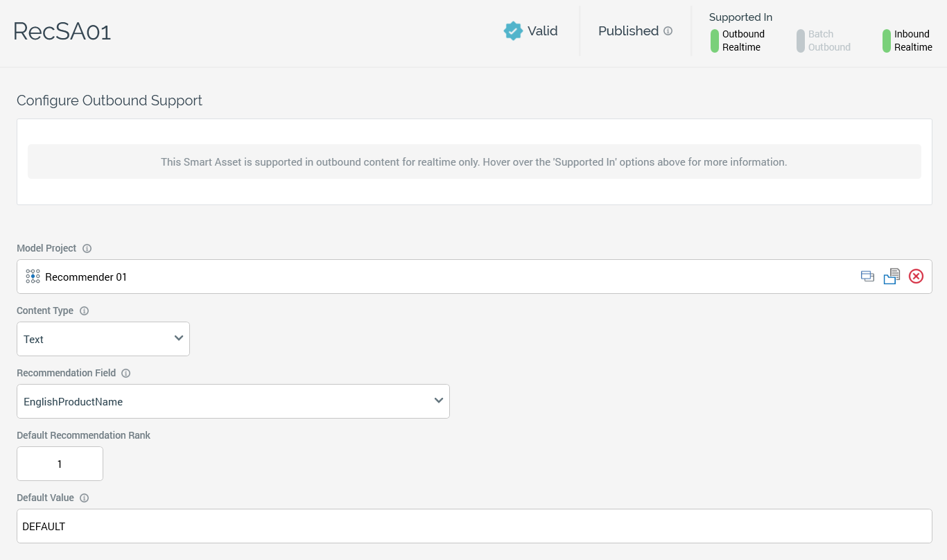 Recommendation smart assets use AML Recommender model outputs to personalize inbound and outbound realtime content. Recommender models provide a series of ranked recommendations based on a series of input data.