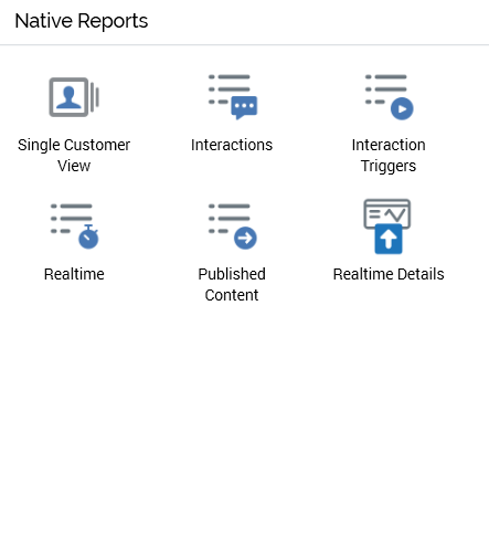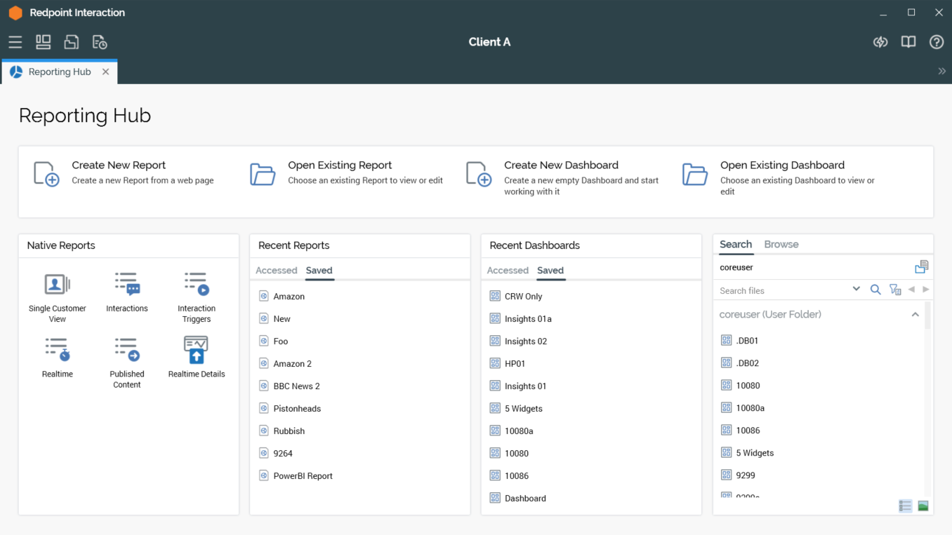 Displayed within a separate tab, the Reporting Hub consists of an unnamed top section, as well as Native Reports, Recent Reports, Recent Dashboards and Folder section. Each is described separately below.