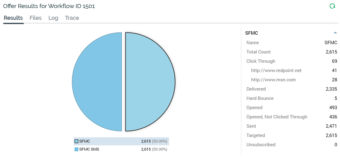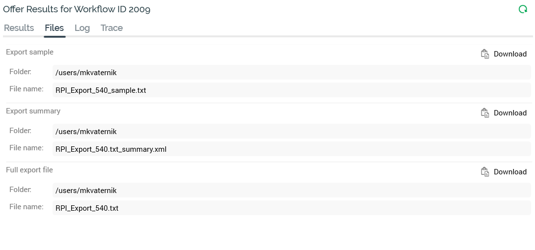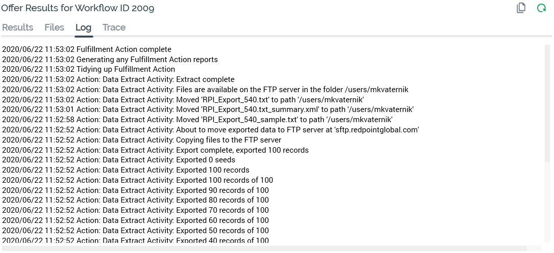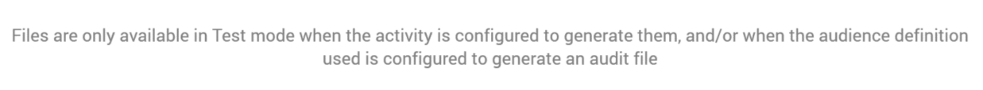 The files tab gives you access to any files created by the activity’s execution. The tab is only displayed when relevant to the activity – for example, it is shown for offers and exports, but not for broadcasts or controls.