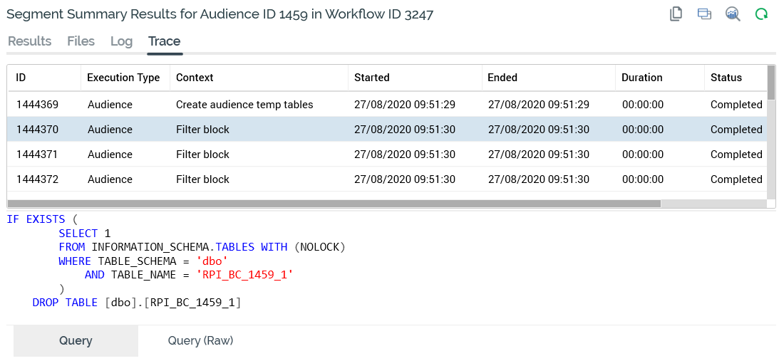 The Trace tab provides visibility of the query statements executed during audience or fulfillment activity execution.
