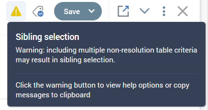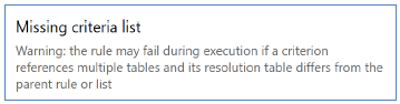 Note that creating this scenario is somewhat convoluted, as, by default, a criterion with a resolution table that differs from its parent rule’s or list’s resolution or resolution table will automatically be created in its own criteria list, with a resolution table matching that of the rule. As such, manual manipulation of resolution level or resolution table is required for the warning to be displayed in the first place.