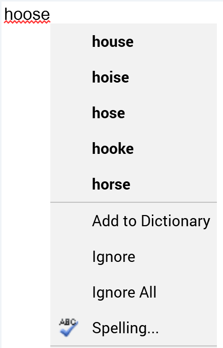 Spelling suggestions: a series of words that might represent a correct alternative to the current spelling error are listed. Selection of a word replaces the incorrectly spelled word with the selected value.