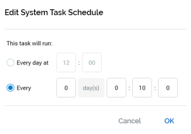 Edit Schedule: this option, accessible from the Actions button’s menu, is only available if the task is Enabled. It allows you to define when the task will execute. Invocation displays the Edit System Task Schedule dialog.