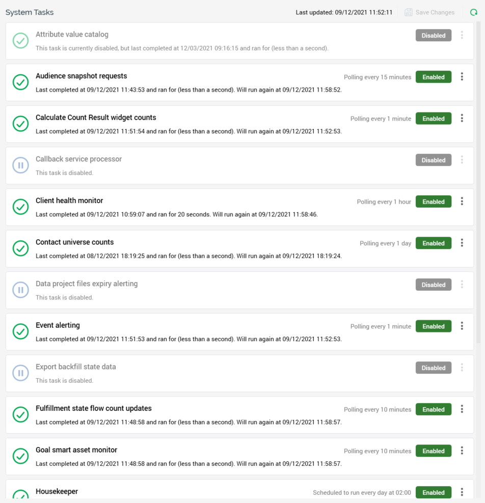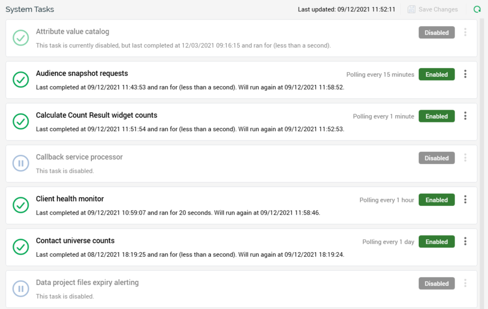 Save Changes: this button is enabled when change(s) have been made to one or more tasks' Enabled status or Schedule details. Invocation persists the changes and removes from display the orange label displayed when outstanding changes are present (documented elsewhere). Following a successful Save, the list of tasks is refreshed to display their current statuses. Note that enabling or disabling a system task, or editing its schedule, generates an audit record.