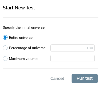 Maximum volume: if this option is selected, up to the specified maximum volume of records will serve as the test data set (if the specified value is greater than the size of the universe, the whole universe will be used). If the radio button is selected, a value between 1 and 9,999,999 must be supplied.