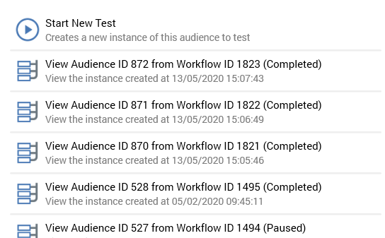This button is only available when no outstanding changes exist within the audience, and when it is valid. On clicking the button, a menu is displayed. If the audience has been tested previously, up to the 100 most recent test instances are listed (with the most recent instance displayed first). Note that each test instance has its own separate Audience (instance) ID and temporary Workflow (instance) ID. The option to start a new test is always provided.
