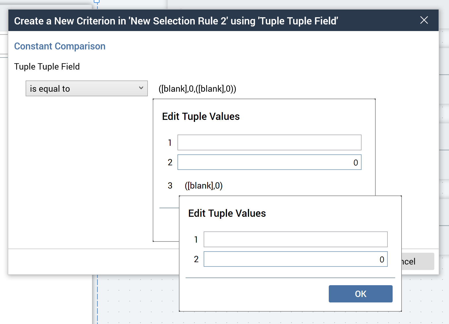 When building a Compare to Constant criterion, and specifying a tuple value, the Edit Tuple Values dialog is displayed: