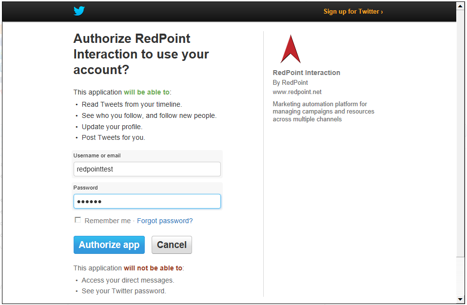 You can enter a Twitter username or email and password (unless you have already signed into Twitter). Having done so, you can Authorize app – thereby authorizing RPI to post messages to Twitter.