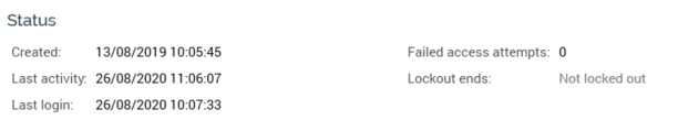 Lockout ends: if a user enters incorrect credentials more than the number of times defined by cluster configuration setting MaxFailedAccessAttemptsBeforeLockout, her or his account is locked out for a time period defined by setting DefaultAccountLockoutTimeSpan. After this period the account is unlocked, and the user may sign in once again. The Lockout ends property displays the date and time at which a locked out user’s account is scheduled to be unlocked.