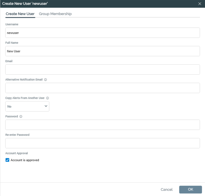 The dialog contains a tab set, within which are displayed two tabs – Create New User and Group Membership.