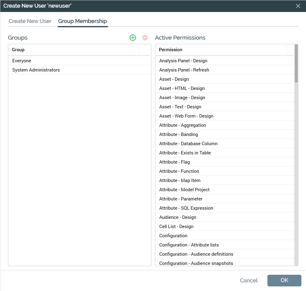 You can click OK to associate the user with the selected user groups. Afterwards, the selected user groups are listed in alphabetical order in the Groups list in the Create New User dialog. Note that you may also cancel the Choose User Groups dialog.