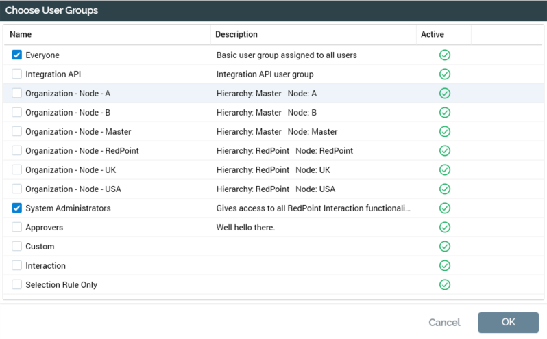 The dialog lists all user groups alphabetically in a grid and facilitates their selection.